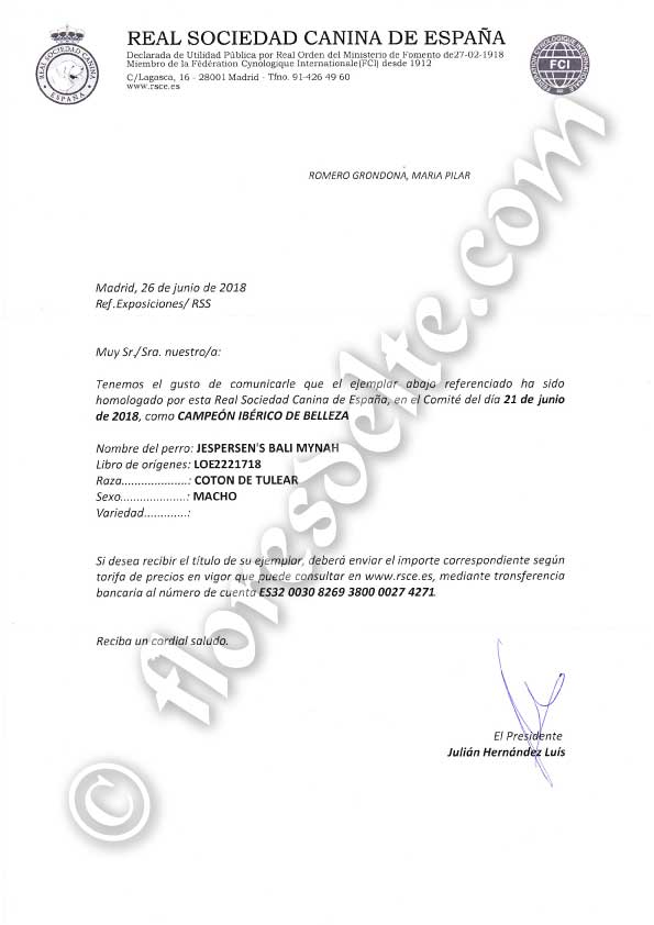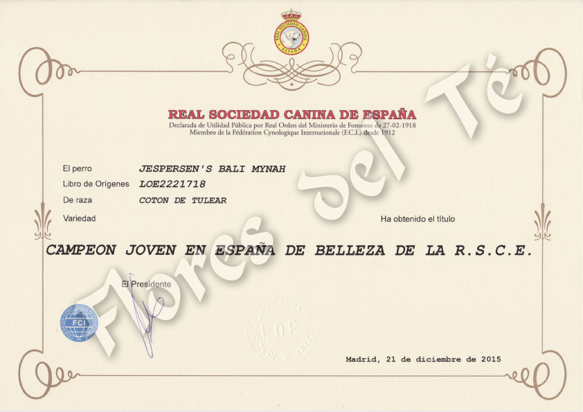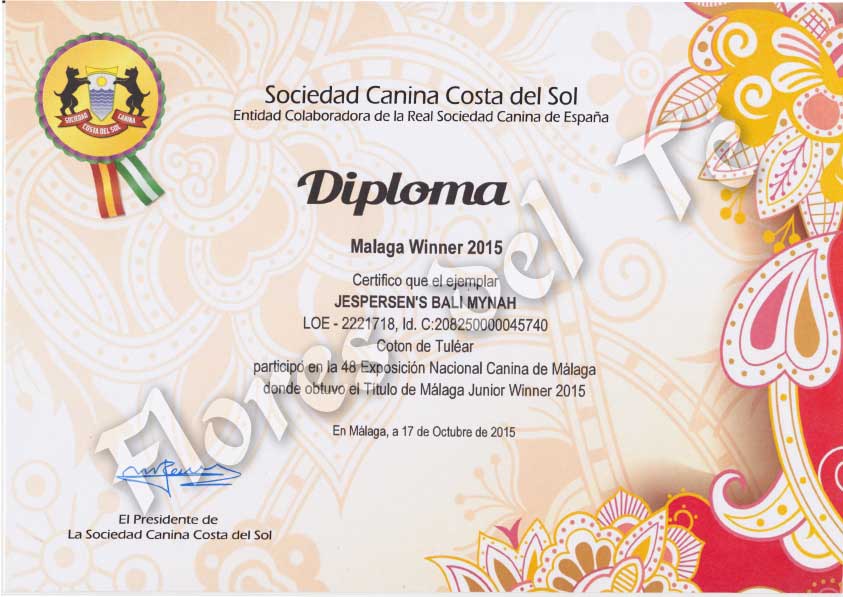 Bali es hijo de la 2 veces campeona del mundo Flamencoton Bahiya y de Calvin du Castell de la Roche aux Fees, y es nieto del campeón internacional Jespersen's Duende Flamenco. Proviene de las mejores líneas de esta raza. Es Campeón Joven de España, Campeón Joven Ibérico, Campeón Joven de Gibraltar y Campeón Joven de Portugal, Campeón de Portugal y Campeón de España.