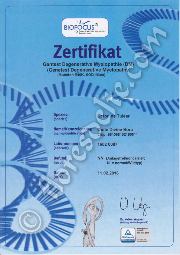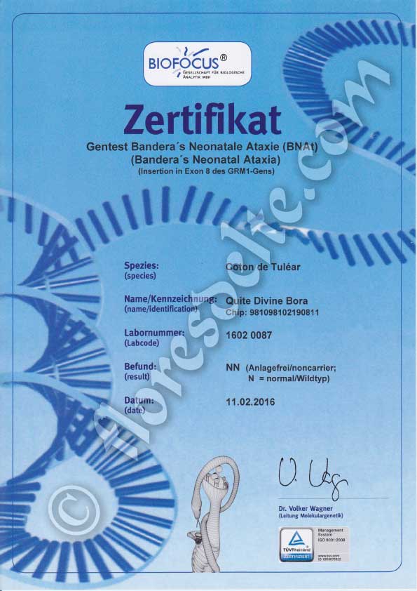 Bora es hija de DIABOLIC CLOWN BUFF y de BABY-DOLL VOM KÖNIGREICH DER ROSE. Muy buenas líneas de raza.